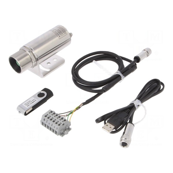 Kompaktowa konstrukcja o wymiarach Ø39x90mm waży 200g. W zestawie znajdują się: kabel połączeniowy, kabel USB oraz uchwyt montażowy umożliwiający stabilne osadzenie urządzenia w miejscu pracy. Urządzenie znajduje zastosowanie w procesach monitoringu temperatury, gdzie wymagana jest ciągła kontrola termowizyjna z wykorzystaniem zewnętrznego zasilania i komunikacji cyfrowej.
