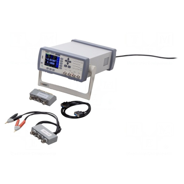 Zasilanie miernika realizowane jest napięciem zasilania w zakresie 100...240V AC. Komunikację z zewnętrznymi systemami zapewniają interfejsy HANDLER, RS232, USB device oraz USB Host. Wymiary fizyczne urządzenia to 264x107x349,5mm. W zestawie: kabel USB, kabel zasilający, płytka zwarciowa, przewody pomiarowe, przystawka pomiarowa T10.