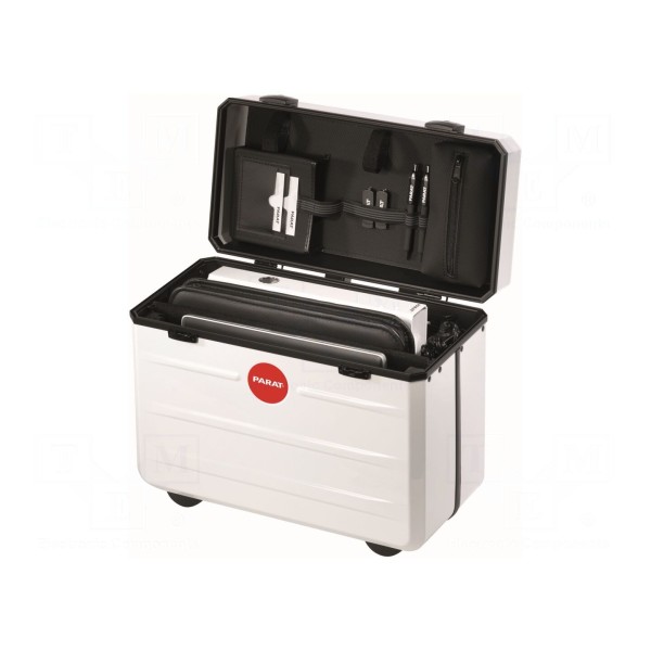 Walizka narzędziowa w wersji z kołami przeznaczona jest do przechowywania oraz transportu wyposażenia. Obudowa modelu utrzymana jest w kolorze białym.