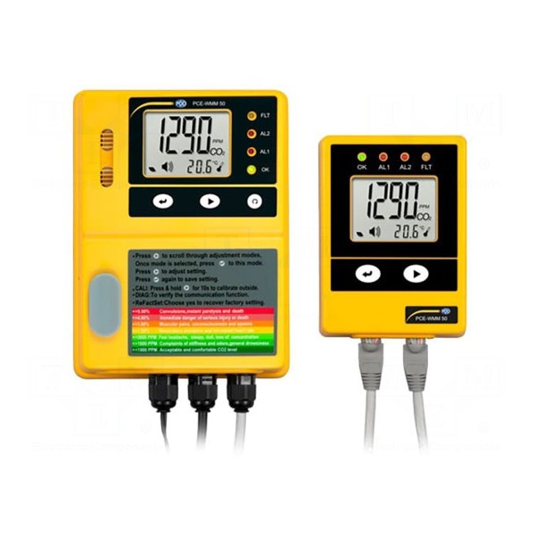 PCE-WMM 50 to stacjonarny wykrywacz gazu przeznaczony do monitorowania stężenia dwutlenku węgla oraz temperatury otoczenia. Zakres pomiarowy urządzenia dla CO2 wynosi od 0 do 50000ppm, natomiast pomiar temperatury realizowany jest w zakresie od 0 do 45°C. Wyniki prezentowane są na czytelnym wyświetlaczu LCD.