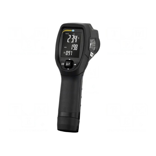 Dokładność pomiaru wynosi ±2°C dla zakresu od 20°C do 500°C oraz ±3°C dla zakresu od -50°C do 20°C. Miernik wyposażono w klasę lasera 2 oraz diodę LED, która wspomaga oświetlenie pola pomiarowego. Użytkownik może przełączać jednostki pomiarowe między °C a °F, a także korzystać z funkcji HOLD, MIN, MAX, DIF, AVG oraz ustawiać alarmy naruszenia wartości granicznych.
