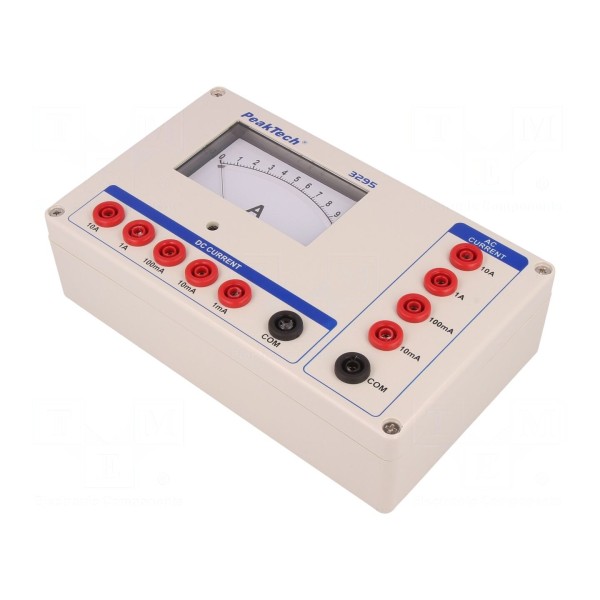 Amperomierz analogowy PeakTech P3295 przeznaczony jest do pomiaru natężenia prądu stałego (DC) oraz przemiennego (AC). Urządzenie obsługuje zakresy prądu stałego wynoszące 1mA, 10mA, 100mA, 1A oraz 10A, a także zakresy prądu przemiennego obejmujące 10mA, 100mA, 1A oraz 10A.