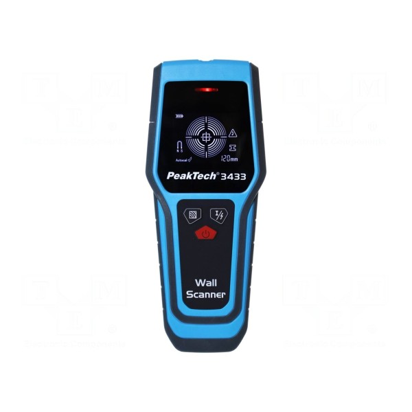 Tester PEAKTECH P3433 to bezdotykowy wykrywacz przeznaczony do lokalizowania drewna, metali oraz przewodów pod napięciem. Urządzenie pozwala na wykrycie drewna do 20mm, metali ferromagnetycznych do 120mm, metali nieferromagnetycznych do 80mm oraz przewodów fazowych do 50mm, przy tolerancji pomiarowej ±10mm.