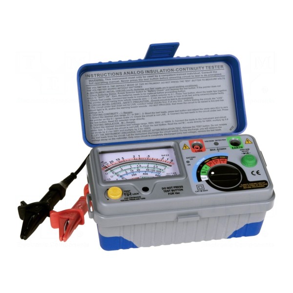 Miernik rezystancji izolacji PEAKTECH P2675 to analogowe urządzenie zaprojektowane do kontroli stanu izolacji przy napięciach pomiarowych 250V, 500V oraz 1kV. Przyrząd umożliwia pomiar rezystancji w zakresach 100MΩ, 200MΩ oraz 400MΩ przy dokładności ±5%. Urządzenie pozwala także na pomiar napięcia AC w zakresie 0–600V z dokładnością ±3%, a także przeprowadzenie testów ciągłości obwodu poniżej 3Ω oraz 500Ω.