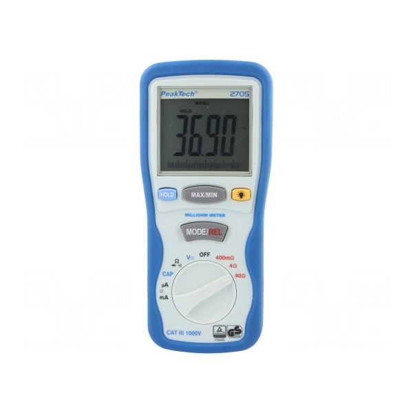 Miliomomierz PeakTech P2705 to urządzenie umożliwiające precyzyjne pomiary rezystancji w zakresach 400mΩ, 4Ω oraz 40Ω z dokładnością ±(1%+10 digit). Przyrząd został wyposażony w wyświetlacz LCD o rozdzielczości 3,75 cyfry (4000). Oprócz funkcji miliomomierza, urządzenie wspiera pomiar napięcia AC/DC do 1kV, prądu AC/DC do 400mA oraz pojemności w zakresie od 4nF do 40mF.