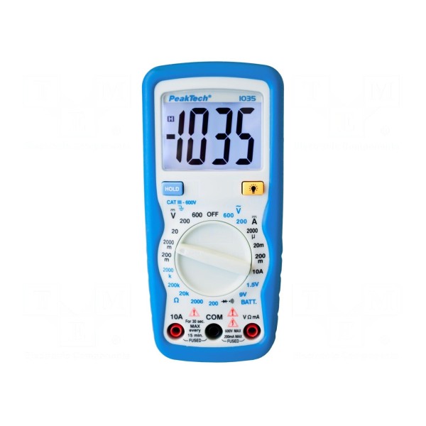 Multimetr cyfrowy PEAKTECH P1035 umożliwia pomiar napięcia stałego do 600V i zmiennego do 600V, a także pomiar prądu stałego do 10A oraz rezystancji do 2MΩ. Urządzenie wyposażone jest w wyświetlacz LCD o rozdzielczości 3,5 cyfry (maksymalne wskazanie 2000). Dokładność pomiaru napięcia DC wynosi ±(0,5% + 2 digit), natomiast dla prądu DC parametr ten określa wartość ±(1% + 2 digit).
