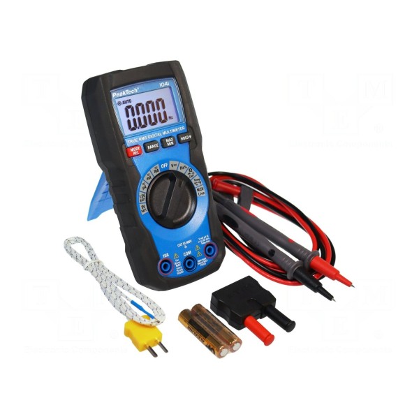 Multimetr cyfrowy PEAKTECH P1041 to przyrząd pomiarowy wyposażony w wyświetlacz LCD o rozdzielczości 3,75 cyfry (4000). Urządzenie obsługuje pomiar rzeczywistej wartości skutecznej True RMS dla prądu przemiennego oraz oferuje szerokie zakresy pomiarowe, obejmujące napięcie DC do 600V (dokładność ±0,5% + 5 digit) oraz AC do 600V (dokładność ±1,2% + 3 digit). Przyrząd umożliwia także pomiar prądu AC i DC do 10A, rezystancji do 40MΩ, pojemności do 99,99mF, częstotliwości do 9,999MHz oraz temperatury w zakresie od -18 do 1000°C.
