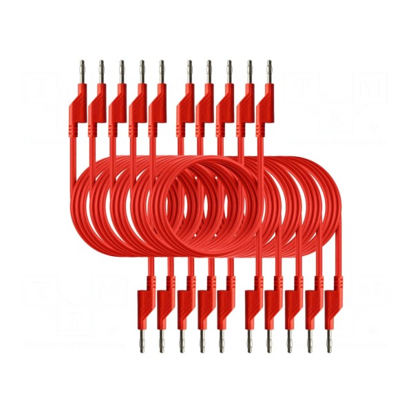 Przewody pomiarowe w kolorze czerwonym o długości 0,75 m przeznaczone są do wykonywania połączeń w układach elektronicznych. Produkt charakteryzuje się maksymalnym natężeniem prądu wynoszącym 10 A oraz dopuszczalnym napięciem roboczym do 50 V AC lub 120 V DC.