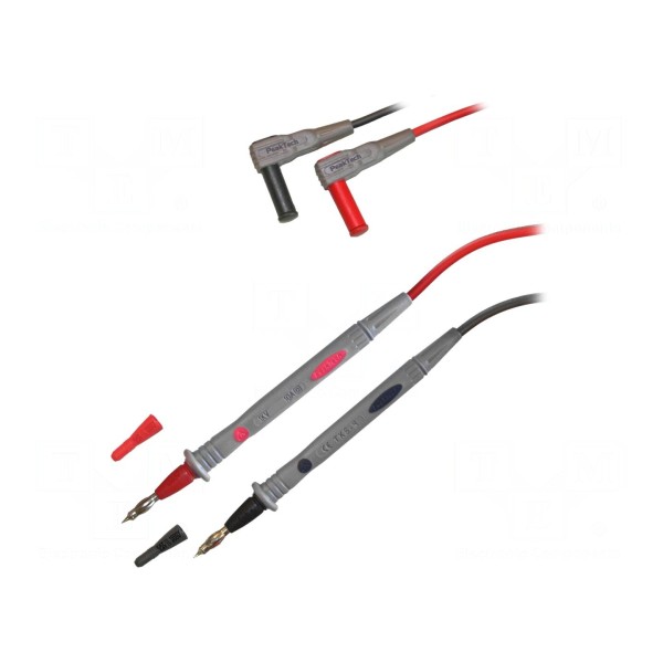 Konstrukcja każdego przewodu obejmuje końcówkę pomiarową oraz kątowy wtyk bananowy 4 mm. Komplet składa się z dwóch sztuk w kolorach czarnym i czerwonym. Produkt jest zgodny z normą EN 61010 i posiada klasyfikację bezpieczeństwa CAT III 1000 V oraz CAT IV 600 V.