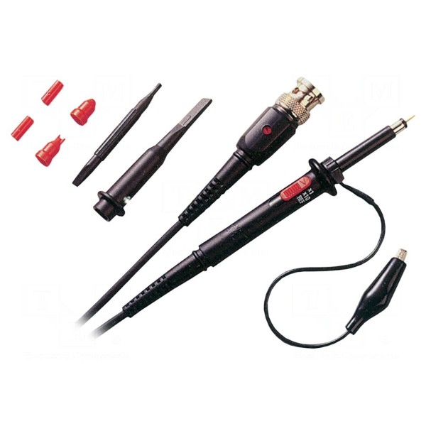 Impedancja wejściowa wynosi 1MΩ/91pF w trybie 1:1 oraz 10MΩ/18pF w trybie 10:1. Sonda zakończona jest wtykiem BNC i posiada przewód o długości 1,2m. Produkt jest zgodny z normą EN 61010 i spełnia wymogi klasyfikacji bezpieczeństwa CAT I 600V oraz CAT II 300V. W zestawie: chwytak haczykowy, identyfikator kanału, końcówka izolacyjna, narzędzie do regulacji, przewód.