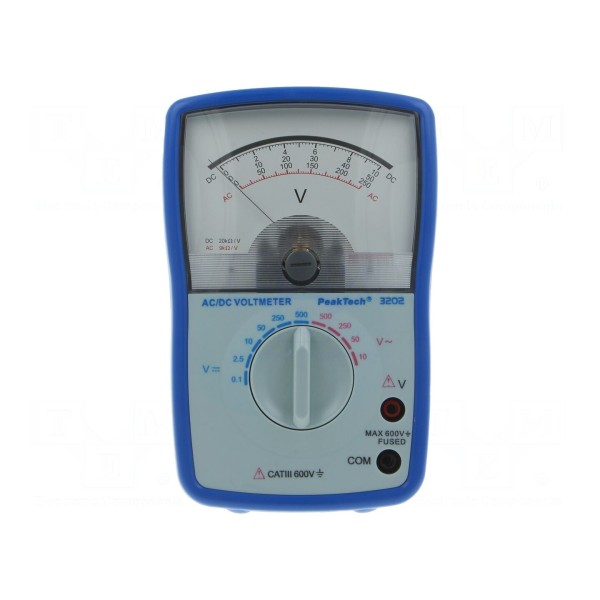 Woltomierz PEAKTECH P3202 to analogowe urządzenie przeznaczone do pomiaru napięcia stałego DC oraz zmiennego AC. Zakresy pomiarowe dla napięcia DC obejmują wartości 100mV, 2,5V, 10V, 50V, 250V oraz 500V przy dokładności ±3%. Pomiary napięcia AC mogą być realizowane w przedziałach 10V, 50V, 250V oraz 500V z dokładnością ±4%.