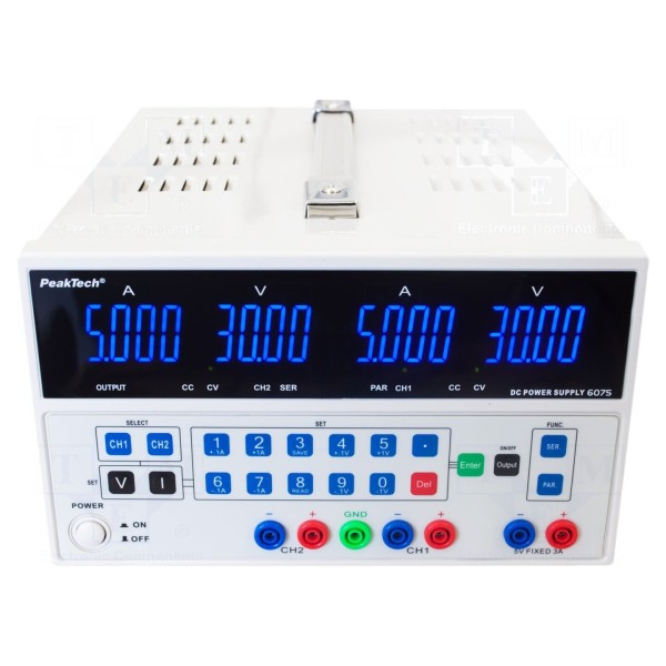 Zasilacz laboratoryjny PEAKTECH P6075 to urządzenie regulowane wyposażone w trzy kanały wyjściowe. Pierwsze dwa kanały oferują napięcie wyjściowe w zakresie 0–30V DC oraz prąd wyjściowy do 5A, natomiast trzeci kanał zapewnia stałe napięcie 5V DC przy prądzie wyjściowym 3A. Łączna moc maksymalna jednostki wynosi 150W, a stabilizacja napięcia utrzymuje się na poziomie poniżej 0,01% + 5mV, przy stabilizacji prądu rzędu 0,02% + 5mA. Tętnienia i szumy dla napięcia regulowanego nie przekraczają 0,5mVrms.