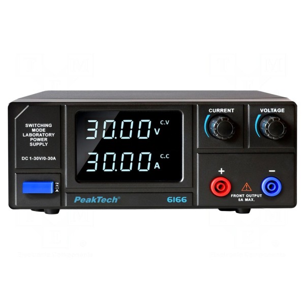 Zasilacz laboratoryjny PEAKTECH P6166 to jednokanałowe urządzenie impulsowe, przeznaczone do regulacji parametrów wyjściowych w zakresie napięcia od 0 do 30V DC oraz prądu od 0 do 30A. Sprzęt oferuje dwa tryby pracy: stałonapięciowy oraz stałoprądowy, co umożliwia dostosowanie charakterystyki wyjściowej do podłączonego obciążenia. Napięcie wejściowe urządzenia wynosi 230V AC.