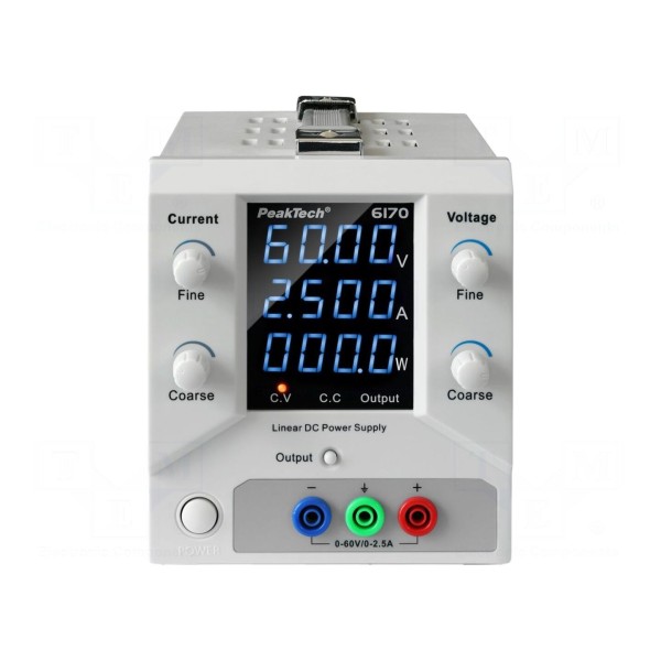 Zasilacz laboratoryjny PEAKTECH P6170 to jednokanałowe urządzenie standardowe, przeznaczone do pracy z napięciem wyjściowym w zakresie od 0 do 60V DC oraz prądem wyjściowym od 0 do 2,5A. Układ charakteryzuje się stabilizacją napięcia na poziomie ≤0,05% + 5mV oraz stabilizacją prądu ≤0,5% + 5mA. Parametry tętnień i szumów dla napięcia regulowanego nie przekraczają 1mVrms.