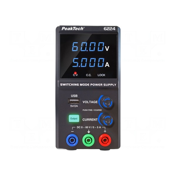 Jednokanałowy zasilacz laboratoryjny PEAKTECH P6224 to urządzenie impulsowe przeznaczone do zasilania układów prądem o regulowanych parametrach. Zasilacz oferuje napięcie wyjściowe w zakresie 0–60V DC oraz prąd wyjściowy do 5A. Urządzenie pracuje w trybach stałonapięciowym (CV) oraz stałoprądowym (CC), co pozwala na precyzyjne dostosowanie parametrów do obciążenia.