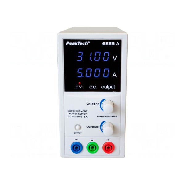 PeakTech P6225A to impulsowy zasilacz laboratoryjny wyposażony w pojedynczy kanał wyjściowy, zapewniający napięcie regulowane w zakresie 0–30V DC oraz prąd o natężeniu 0–5A. Urządzenie charakteryzuje się rozdzielczością ustawień na poziomie 10mV dla napięcia oraz 1mA dla prądu. Parametry te pozwalają na dokładną pracę przy zachowaniu stabilizacji napięcia na poziomie ≤50mV oraz stabilizacji prądu ≤20mA.