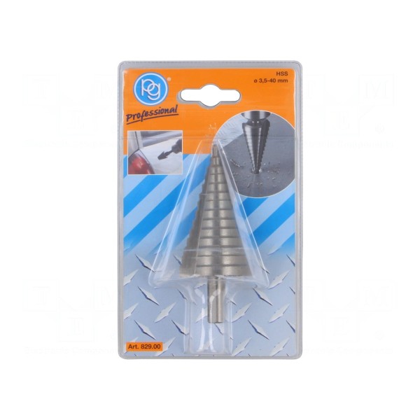 Wiertło PG PROFESSIONAL 829.00 to akcesorium o konstrukcji stopniowej, stożkowej i wielostopniowej. Narzędzie zostało zaprojektowane do obróbki otworów o średnicy w zakresie od 3,5mm do 40mm.