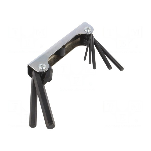 Zestaw zawiera siedem kluczy typu imbus wykonanych ze stali chromowo-wanadowej. Narzędzia charakteryzują się czernioną powierzchnią, co wpływa na ich parametry użytkowe.