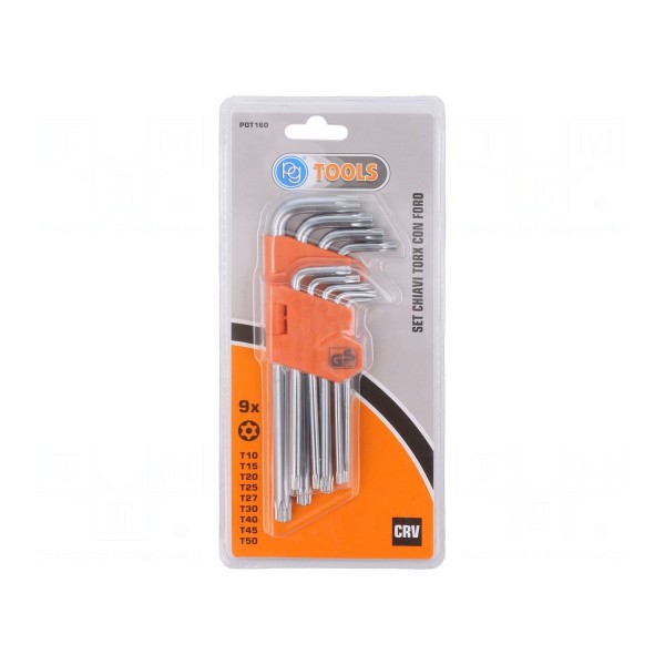 Zestaw kluczy typu Torx obejmuje 9 elementów o zróżnicowanych rozmiarach roboczych, w tym TX10, TX15, TX20, TX25, TX27, TX30, TX40, TX45 oraz TX50. Narzędzia zostały wykonane ze stali chromowo-wanadowej, co zapewnia ich wytrzymałość podczas pracy z odpowiednimi śrubami.