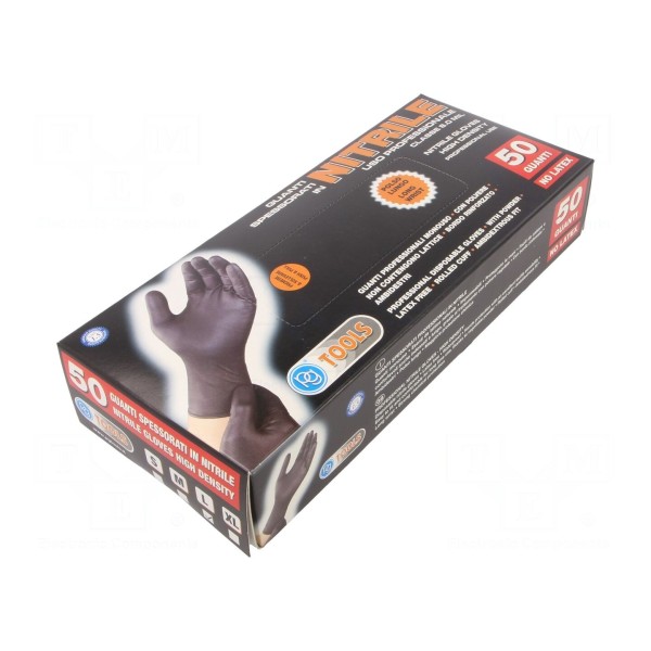 Rękawice ochronne wykonane z nitrylu w kolorze czarnym, przeznaczone do ochrony dłoni. Produkt cechuje się grubością materiału wynoszącą 0,8 mm oraz rozmiarem 9 (L).