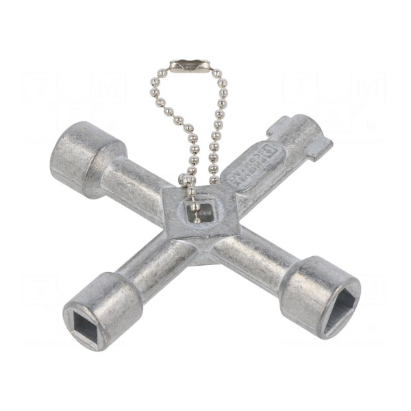 Klucz do szaf sterowniczych o długości 72 mm służy do obsługi różnorodnych zamknięć technicznych. Narzędzie zostało wyposażone w specjalistyczne końcówki, w tym kwadrat 6 mm, kwadrat 8 mm (A) oraz trójkąt 9 mm.