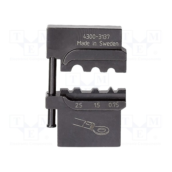Szczęki do zaciskania są przeznaczone do obróbki konektorów nieizolowanych. Element umożliwia pracę z przewodami o przekroju 0,75mm², 1,5mm² oraz 2,5mm².