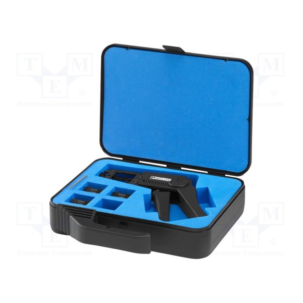 W zestawie: matryca x6, praska zaciskowa, walizka. Narzędzia dostarczane są w praktycznej walizce, która ułatwia przechowywanie oraz organizację wszystkich komponentów zestawu.