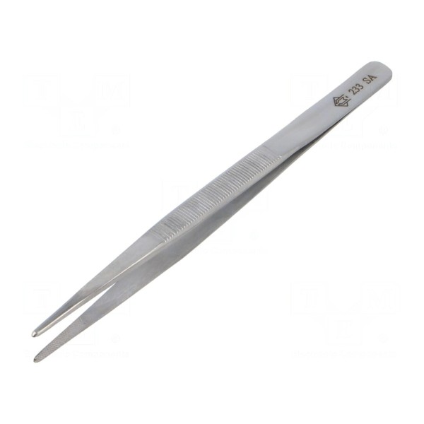 Pęseta o długości 160 mm posiada wąskie ostrza, które umożliwiają precyzyjną pracę z drobnymi elementami. Konstrukcja końcówki charakteryzuje się zaokrąglonym kształtem.