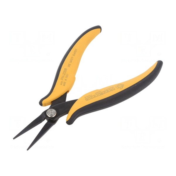 Narzędzie typu szczypce przeznaczone jest do chwytania oraz gięcia elementów. Konstrukcja posiada wydłużone, płaskie końcówki robocze z gładkimi powierzchniami chwytającymi, co umożliwia precyzyjną manipulację przedmiotami.