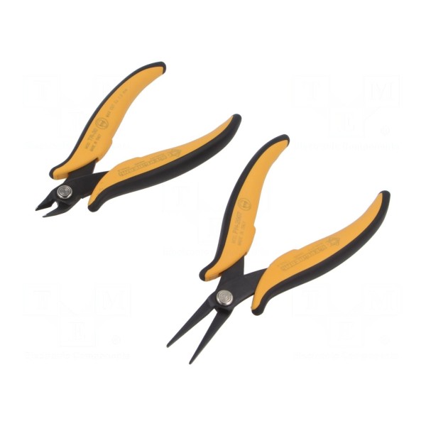 Zestaw zawiera dwa rodzaje szczypiec przeznaczonych do prac montażowych i serwisowych. W komplecie znajdują się szczypce do chwytania PN2007 oraz szczypce do cięcia bocznego TR30, co pozwala na wykonywanie różnorodnych czynności manualnych.