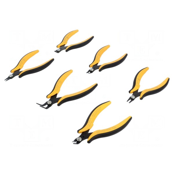 Zestaw narzędzi zawiera sześć sztuk szczypiec przeznaczonych do prac precyzyjnych. Komplet został umieszczony w funkcjonalnym etui, które ułatwia przechowywanie oraz organizację narzędzi w miejscu pracy.