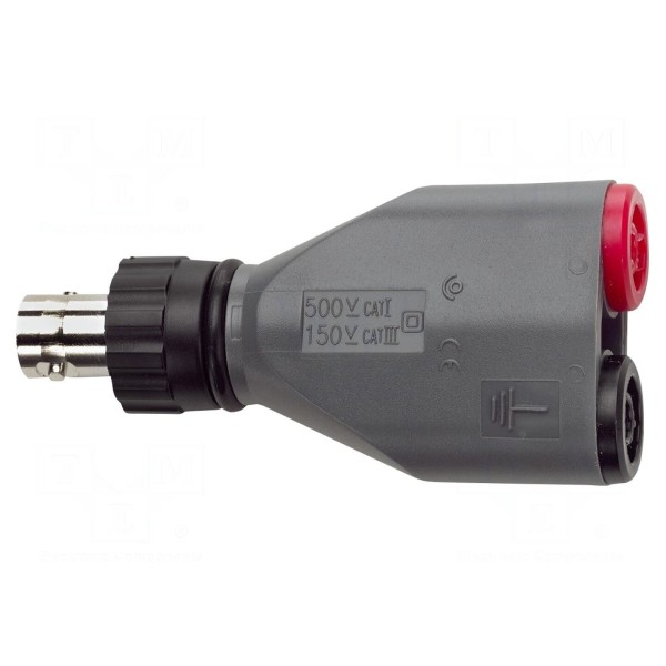 Adapter umożliwia konwersję złącza BNC typu żeńskiego na dwa gniazda bananowe o średnicy 4 mm. Komponent posiada prąd znamionowy wynoszący 3A, co pozwala na wykorzystanie w standardowych aplikacjach pomiarowych wymagających przejścia między tymi typami przyłączy.