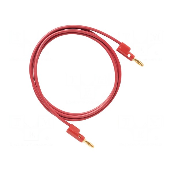 Przewód pomiarowy o długości 0,914 m wykonany w kolorze czerwonym. Konstrukcja elementu obejmuje dwa chwytaki haczykowe oraz podwójny wtyk bananowy wyposażony w gniazdo osiowe i poprzeczne 4 mm. Złącza charakteryzują się możliwością sztaplowania, co pozwala na rozbudowę połączeń w układach pomiarowych.