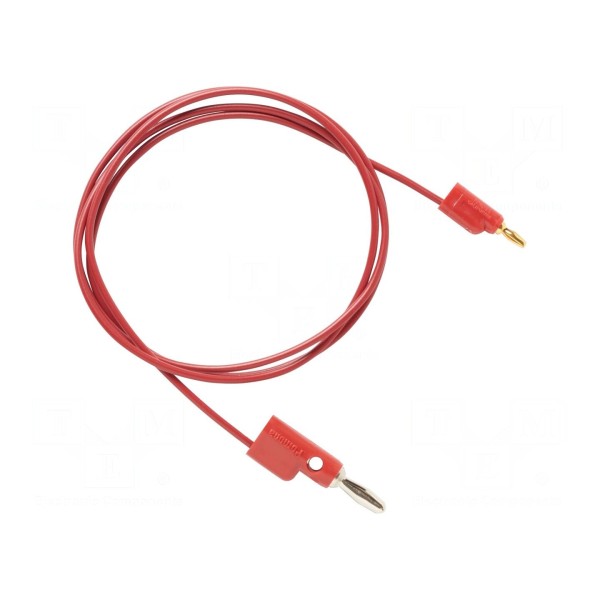 Przewód pomiarowy w kolorze czerwonym przeznaczony jest do pracy przy maksymalnym natężeniu prądu 5A. Element charakteryzuje się napięciem znamionowym wynoszącym 30V AC oraz 60V DC. Konstrukcja przewodu o długości 1,524 m została wykonana z wykorzystaniem wtyku bananowego z gniazdem osiowym 2 mm oraz wtyku bananowego z gniazdem osiowym i poprzecznym 4 mm.