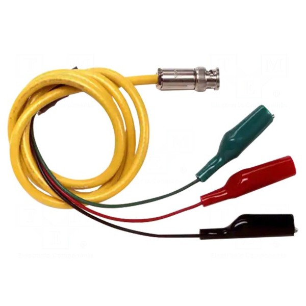 Przewód pomiarowy o impedancji 50Ω charakteryzuje się długością 0,92m. Jego budowa obejmuje wtyk BNC oraz trzy zaciski krokodylkowe, co umożliwia realizację połączeń w układach elektronicznych.