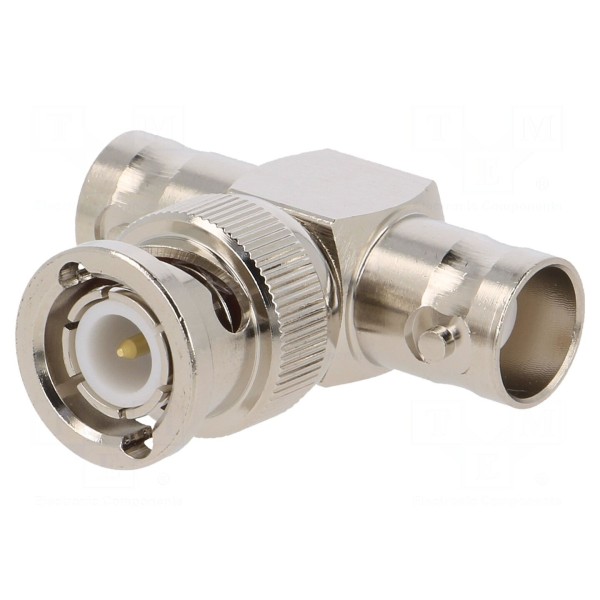 Trójnik BNC o impedancji falowej 50Ω służy do rozgałęziania sygnałów w torach pomiarowych. Element posiada konfigurację wejść i wyjść obejmującą dwa gniazda BNC oraz jeden wtyk BNC.