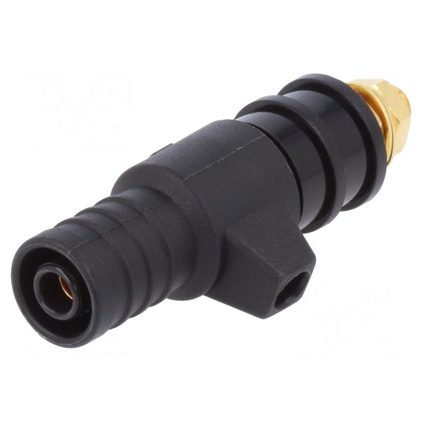 Komponent spełnia wymagania kategorii bezpieczeństwa CAT II 600V, co pozwala na stosowanie go w odpowiednich środowiskach laboratoryjnych. Element wykończony jest w kolorze czarnym, co ułatwia identyfikację polaryzacji w większych zespołach złączy.