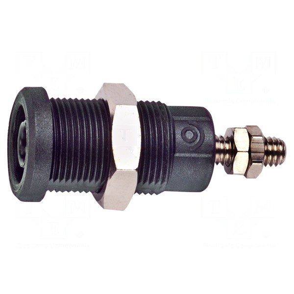 Złącze laboratoryjne w formie gniazda bananowego 4mm przeznaczone jest do montażu na panelu. Element charakteryzuje się napięciem znamionowym 1kV oraz prądem znamionowym 36A. Produkt jest zgodny z normami bezpieczeństwa CAT III 1000V oraz EN 61010.