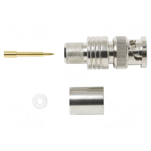 Złącze BNC typu męskiego jest przeznaczone do montażu poprzez zaciskanie na przewodzie. Produkt charakteryzuje się prostą orientacją przestrzenną oraz impedancją wynoszącą 50Ω.