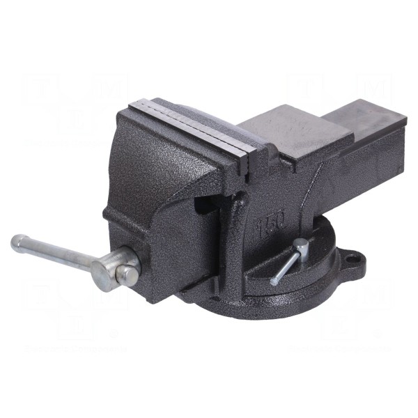 Imadło stołowe o szerokości szczęk 150mm wykonane zostało ze stopu żelaza. Konstrukcja narzędzia obejmuje zintegrowane kowadło oraz obrotową podstawę, co pozwala na regulację kąta ustawienia obrabianego elementu względem podłoża.
