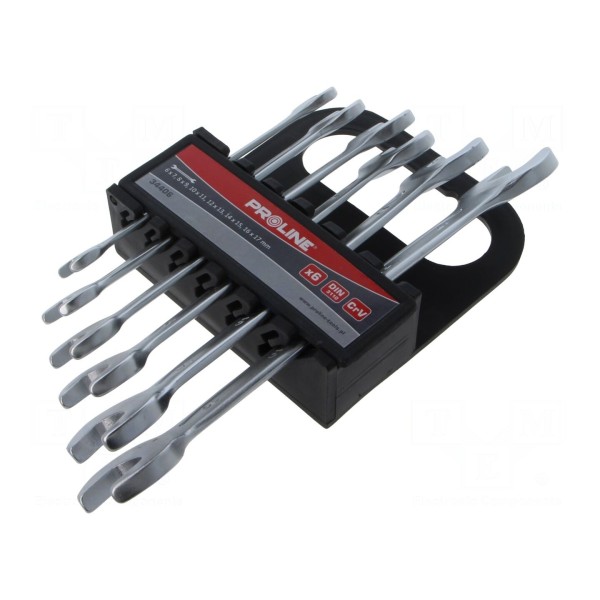 Zestaw zawiera sześć kluczy płaskich wykonanych ze stali chromowo-wanadowej, co zapewnia trwałość narzędzi podczas pracy. Klucze zostały poddane procesowi kucia na zimno, a ich powierzchnia jest chromowana, co zwiększa odporność na korozję.