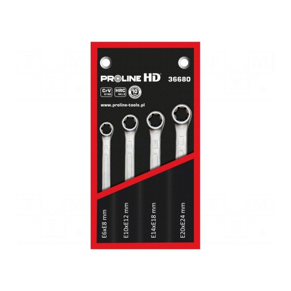 Zestaw zawiera cztery klucze oczkowe typu Torx, przeznaczone do pracy ze śrubami z łbem typu E. Narzędzia obejmują zakres rozmiarów E6, E8, E10, E12, E14, E18, E20 oraz E24.
