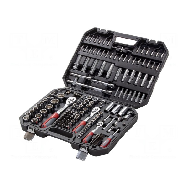 W zestawie: grzechotka 1/2", grzechotka 1/4", grzechotka 3/8", końcówki wkrętakowe, nasadki Torx, przedłużacz 1/2" o długości 125mm, przedłużacz 1/2" o długości 250mm, przedłużacz 1/4" o długości 50mm, przedłużacz 1/4" o długości 100mm, przedłużacz 3/8" o długości 125mm.