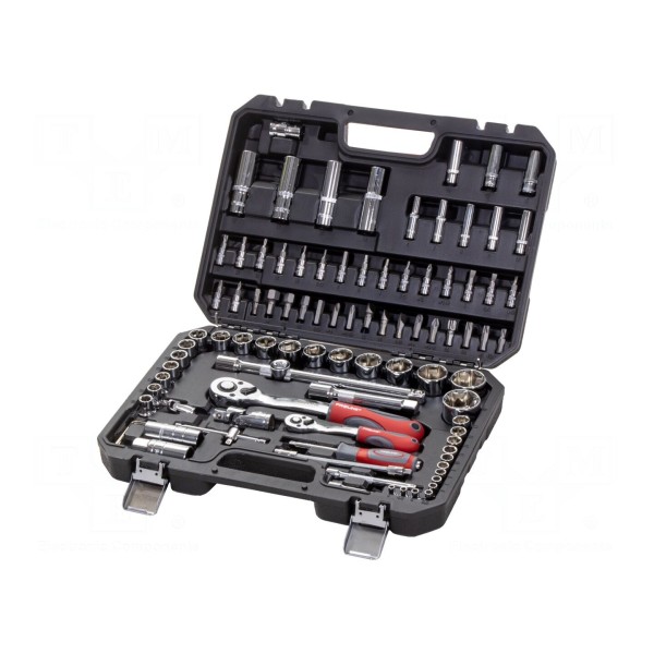 Zestaw zawiera 94 elementy, w tym klucze nasadowe 6-kątne przeznaczone do prac montażowych i warsztatowych. Komplet narzędzi został uporządkowany w walizce, która ułatwia przechowywanie oraz transport całego wyposażenia.