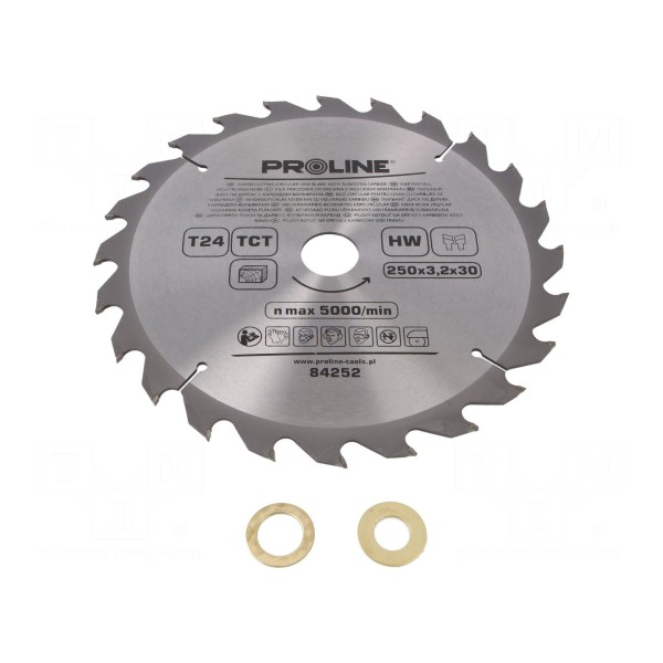 Tarcza posiada otwór montażowy o średnicy 30 mm. Ilość zębów wynosi 24 sztuki, co jest parametrem dostosowanym do określonego rodzaju cięcia. W zestawie znajdują się pierścienie redukujące średnicę otworu mocującego.