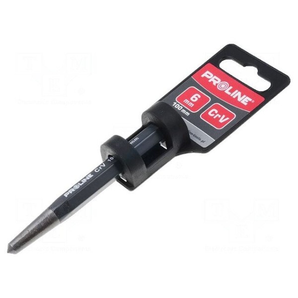 Narzędzie typu punktak o długości całkowitej 100 mm przeznaczone do oznaczania punktów na powierzchniach materiałów. Konstrukcja wykonana została ze stali chromowo-wanadowej, co zapewnia parametry użytkowe materiału bazowego.