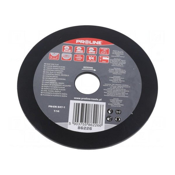Tarcza szlifierska PROLINE o średnicy 125 mm jest przeznaczona do obróbki drewna. Element posiada płaską konstrukcję wyposażoną w tarnik, co umożliwia efektywne ścieranie materiału.