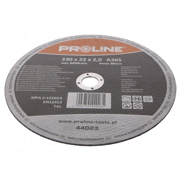 Tarcza tnąca o średnicy 230 mm oraz grubości 2 mm przeznaczona jest do współpracy z elektronarzędziami wyposażonymi w odpowiedni uchwyt montażowy. Osprzęt posiada otwór montażowy o średnicy 22 mm, zapewniający mocowanie na wrzecionie urządzenia.