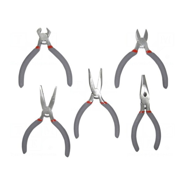 Zestaw zawiera pięć sztuk szczypiec o długości 120 mm. W komplecie znajdują się narzędzia typu: do cięcia, nastawne, półokrągłe oraz uniwersalne.