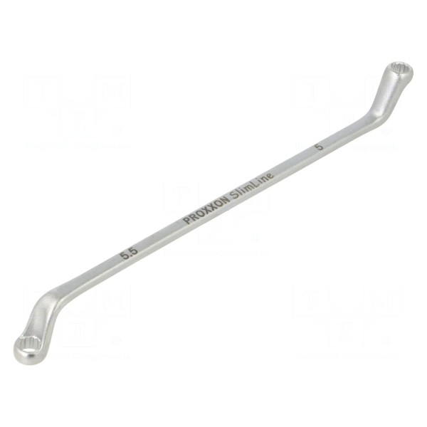 Klucz oczkowy PROXXON z serii SlimLine jest narzędziem dwustronnym o rozmiarach 5 mm oraz 5,5 mm. Konstrukcja typu oczkowego pozwala na stabilne osadzenie na łbie śruby lub nakrętce, co umożliwia przekazywanie wysokich momentów obrotowych.